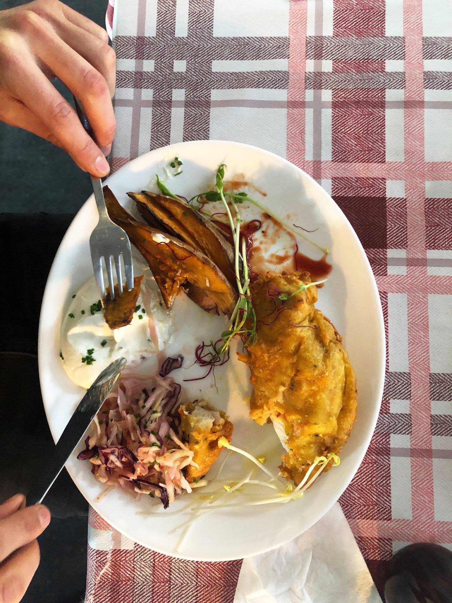 TEMPURA – Gebackenes Tempura Gemüse, vegan, Sweet Chili, Weißkraut & Dip 8,50CRISPY SESAM CHICKEN – Hähnchenbrust in Sesamteig gebacken mit Süsskartoffeln & Dip 9,50PULLED PORK PLAIN BURGER– Zart mariniertes Schweinefleisch aus dem Smoker im Weizenbun mit hausgemachter BBQ Sauce & Krautsalat, Rosmarinkartoffeln & Dip 10,00